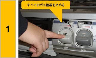 器具栓を閉じるか、運転スイッチを切り、すべてのガス機器を止めてください。屋外の機器も忘れずに。使っていないガス栓は閉まっていることを確認してください。 |