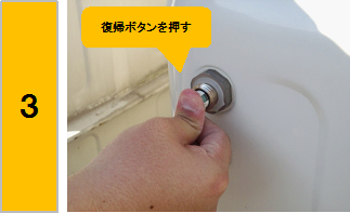 復帰ボタンが止まるまでしっかり押して、ゆっくり手を離してください。ボタンの押し部が赤から緑にかわり表示ランプが点滅し、液晶が「99」からカウントダウンを始めます。 |