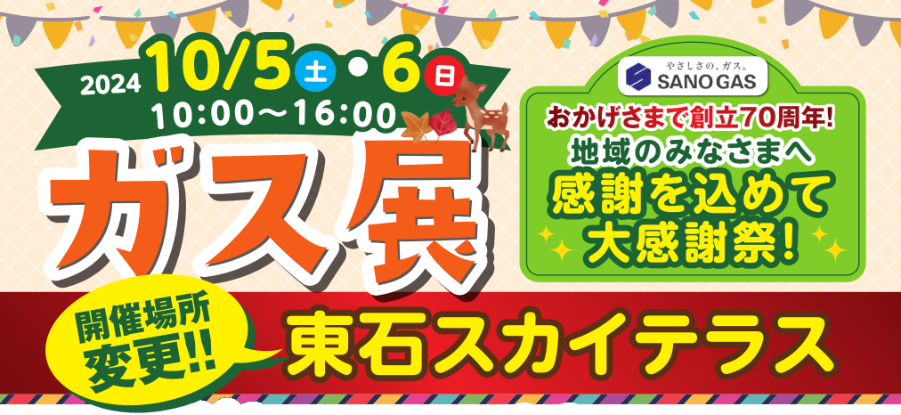今年は会場を新たに「東石スカイテラス」に開催場所を変更して、地域のみなさまへ感謝を込めて大感謝祭として「ガス展」を開催します!