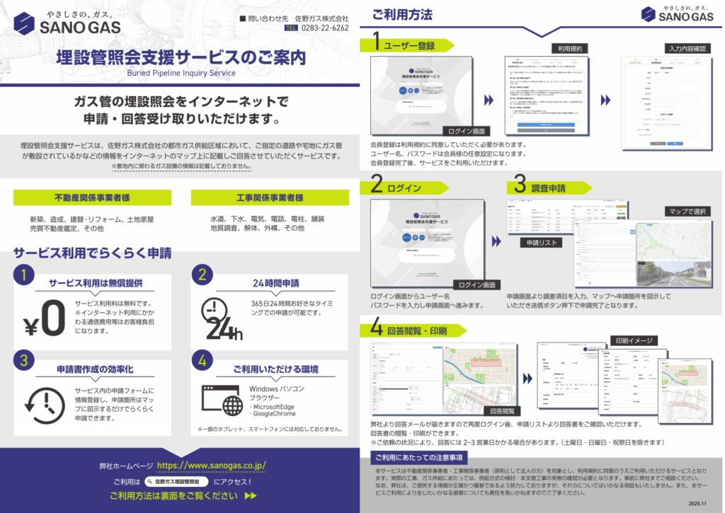 今後、ガスの埋設管照会をインターネットで申請・回答をお受け取りいただけますので、ぜひご利用ください。