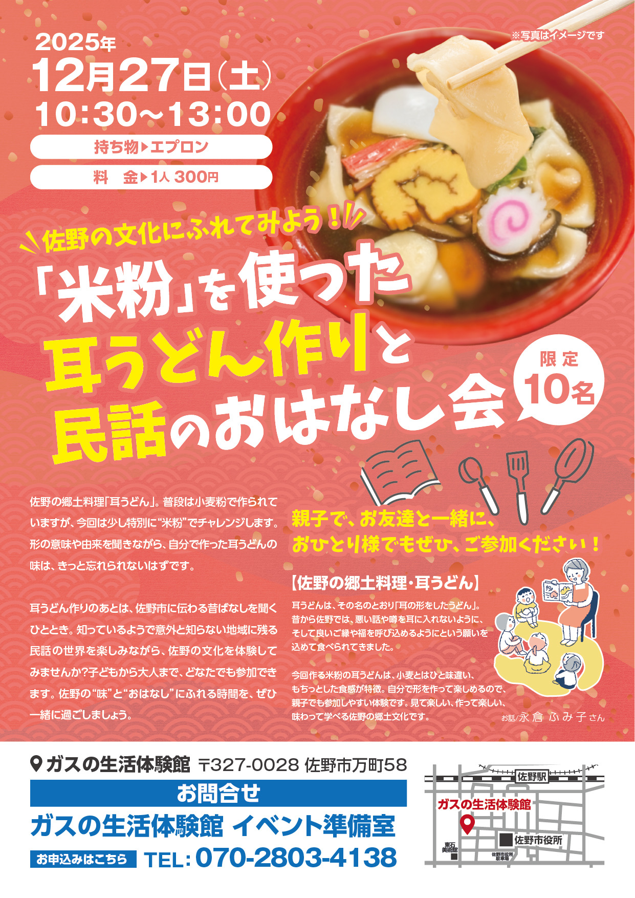 ガスの生活体験館 「米粉」を使った耳うどん作りと民話のおはなし会 開催のご案内
